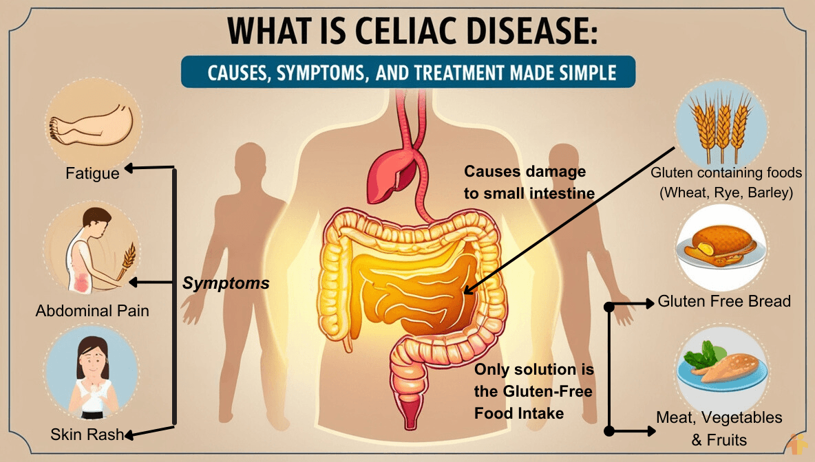 Celiac disease is an autoimmune disorder where the body mistakenly identifies gluten as a threat. When someone with celiac disease eats gluten, their immune system attacks their small intestine, causing inflammation and damage to the intestinal lining. This damage makes it difficult for the body to absorb nutrients, leading to symptoms such as: